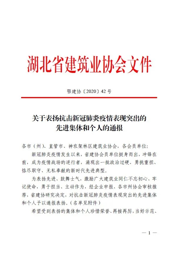 近日,湖北省建筑业协会传来喜讯,致远市政荣获抗击新冠肺炎疫情表现突出先进集体,彭骏、张涛涛、胡道敏、阎进诚、唐家齐荣获抗击新冠肺炎疫情表现突出先进个人。